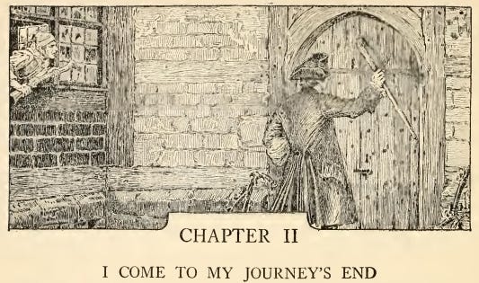 The night had begun to fall as I got close; and in three of the lower windows, which were very high up and narrow, and well barred, the changing light of a little fire began to glimmer. Was this the palace I had been coming to? Was it within these walls that I was to seek new friends and begin great fortunes? Why, in my father’s house on Essen-Waterside, the fire and the bright lights would show a mile away, and the door open to a beggar’s knock!
