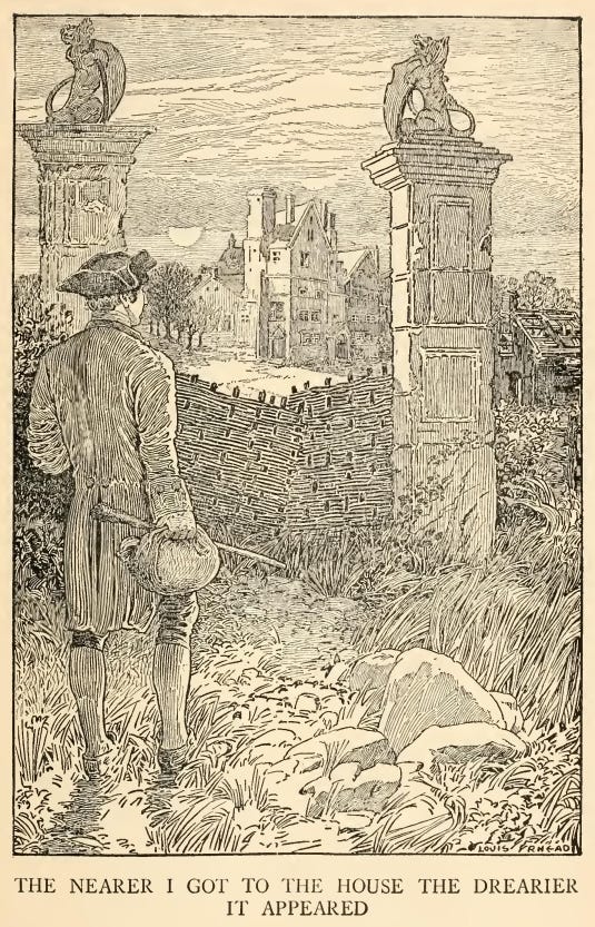 It was drawing on to sundown when I met a stout, dark, sour-looking woman coming trudging down a hill; and she, when I had put my usual question, turned sharp about, accompanied me back to the summit she had just left, and pointed to a great bulk of building standing very bare upon a green in the bottom of the next valley. The country was pleasant round about, running in low hills, pleasantly watered and wooded, and the crops, to my eyes, wonderfully good; but the house itself appeared to be a kind of ruin; no road led up to it; no smoke arose from any of the chimneys; nor was there any semblance of a garden. My heart sank. “That!” I cried.